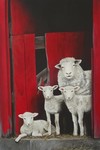 2018Een schaap met 3 lammetjes kijken nieuwsgierig vanuit de stal naar buiten.